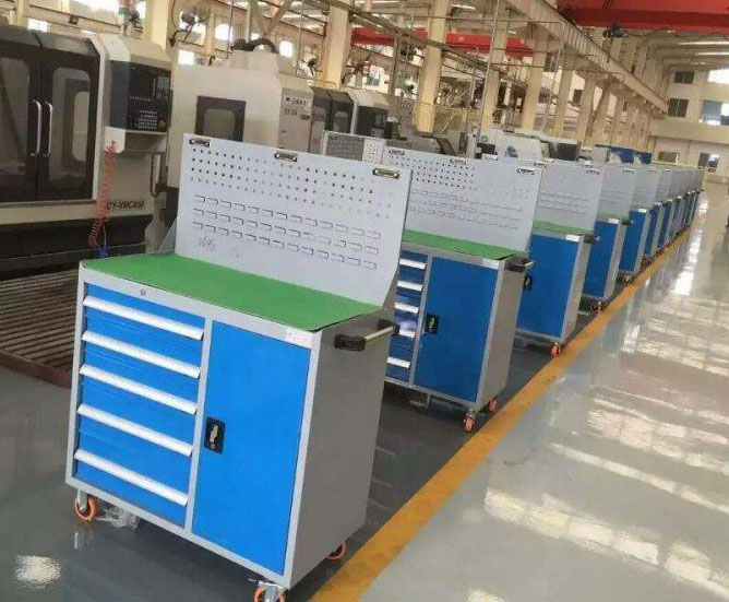 工具車適用于工具、刀具、零部件在生產現場中的定置管理,使您的物品存取工作真正做到準時、準確、高效、低耗。 結構特點 編輯 1、 高強度的結構設計和噴粉表面處理工藝,能適應工廠較復雜的工作環境。 2、 裝有優質軸承和導軌,保證抽屜承受額定載荷時亦能輕松順暢開合。 3、 根據需要可自由選擇配置不同高度的抽屜,充分滿足生產現場的需要。 4、 可以配置帶有防油膠墊的頂框,保護放置物品不受損害以及防止物品滑落。 5、 鎖具先進,只用一把鎖就能鎖上所有的抽屜,保證物品安全。 6、 柜體底部配有墊腳,保護柜體在放置或移動時不受損壞,方便用叉車搬運。 多種表面顏色,滿足生產現場整體布置的需求 7. 全寬型鋁合金抽屜把手及可更換的標簽,美觀、方便、實用。 8. 先進的抽屜安全扣設計,保證抽屜在關閉后不會意外滑出。 9. 更有4種國際標準色以供選擇(ral5005,ral5015,ral6011,ral7035),滿足生產現場整體布置的需要。 10. 采用國際先進水平鎖具,只一把鎖就能鎖上所有抽屜,保證物品安全。 11. 加底框及高品質的腳輪,推行平穩,方向性好,剎車固定后不會滑動。 12. 先進的互鎖裝置,在打開一個抽屜時其他抽屜自動鎖死不能打開,防止抽屜全部打開造成柜體傾斜。 13.工具車的工作臺面采用獨特的注塑成型,強度更高。 14.中央鎖采用環形鎖匙結構,可延長鎖的使用壽命。 15.工具車四角都配有新型復合材料制成的防撞條,能有效的緩沖意外碰撞造成的損害。 16.工具車的重型車輪,125MM直徑更容易跨越障礙物。 17.臺面有特殊的小凹槽,可用來盛放黃油等液體,方便使用。 18.工具車抽屜內可以存放豐富的工具模塊。 19.抽屜兩側采用疊加式滾珠滑軌,具有優秀的順暢度。 20.工具車的每個抽屜擁有自鎖功能。 21.工具車兩側采用網孔板內加鋼板的雙層鋼板設計,使車體更加堅固,持久耐用。 工具車與工具柜的區別 工具車是可以移動的工具柜,適合在生產現場安全、合理地運送工具和配件。 工具車由各種型號的工具柜增加頂柜和腳輪等移動部件組成。 工具車的外型尺寸的高度:重型工具車為所選用的工具柜的高度加上140mm;輕型工具車為所造工具柜高度加上80mm。高強度的結構設計和陰極電泳底漆表面處理工藝,能適應工廠較復雜的工作環境。